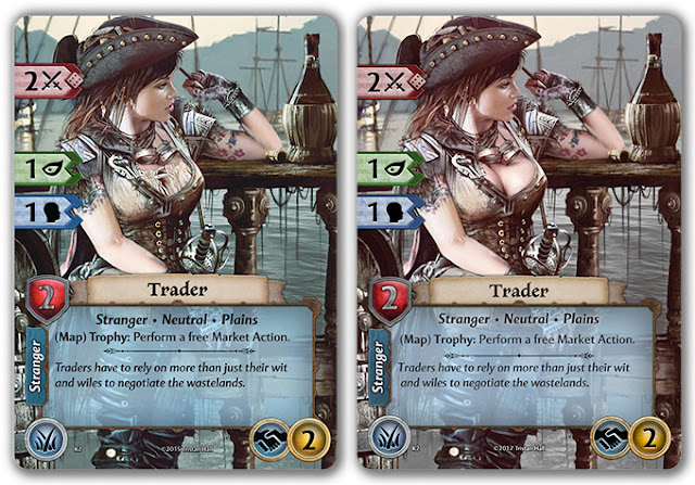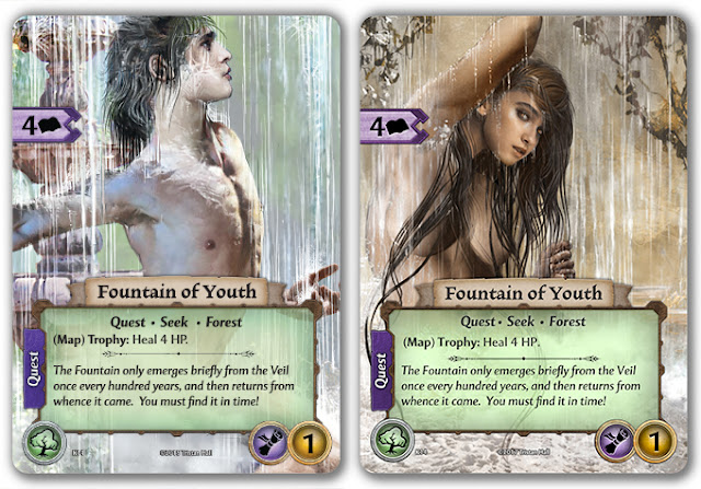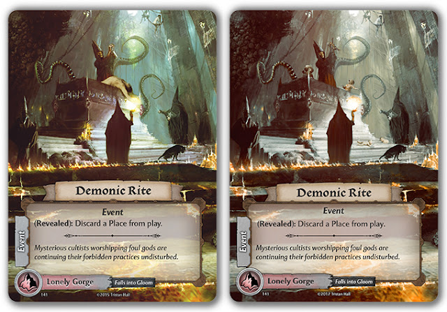 Here are some example cards from the Dark Gloom pack, with the original cards on the left for comparison. If you find any of the Dark Gloom expansion distasteful, remember it is only an optional add-on and not required for play. If you do happen to choose to add Dark Gloom to your pledge you can simply swap in the alternative art card, or shuffle it into its encounter deck in addition to the original version as appropriate (with Night cards you will have to choose one or the other). There may be slight changes between the layouts or saturation of the cards below, but don’t worry, that’s only because I popped the images together in PhotoShop (you’ll have to forgive blogspot’s horrible image formatting too).