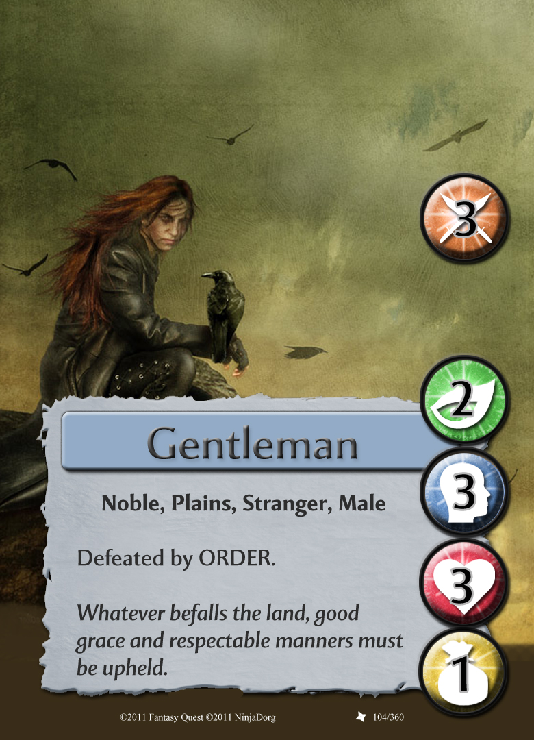 Before long I had gathered most of my Saga’s Keywords and was carrying with me a great Dwarven Axe, the spirit of a Battle Elemental, the scalps of some evil Bandits, and the blessings of a wandering Watchman and a Tradesman who I’d met and successfully Influenced whilst on the road. I’d even found the Abode I was after – the Forgotten Ruins – but the land around it had Fallen into Gloom, meaning any time I spent there would damage my Vampiric Warrior. I hesitated, preoccupied with a foolish Wager, and Excessive Taxes that drained my coffers, and was further beset by a Jousting match and a Gentleman with a grudge – who I ended up having to dispatch in bloody combat.