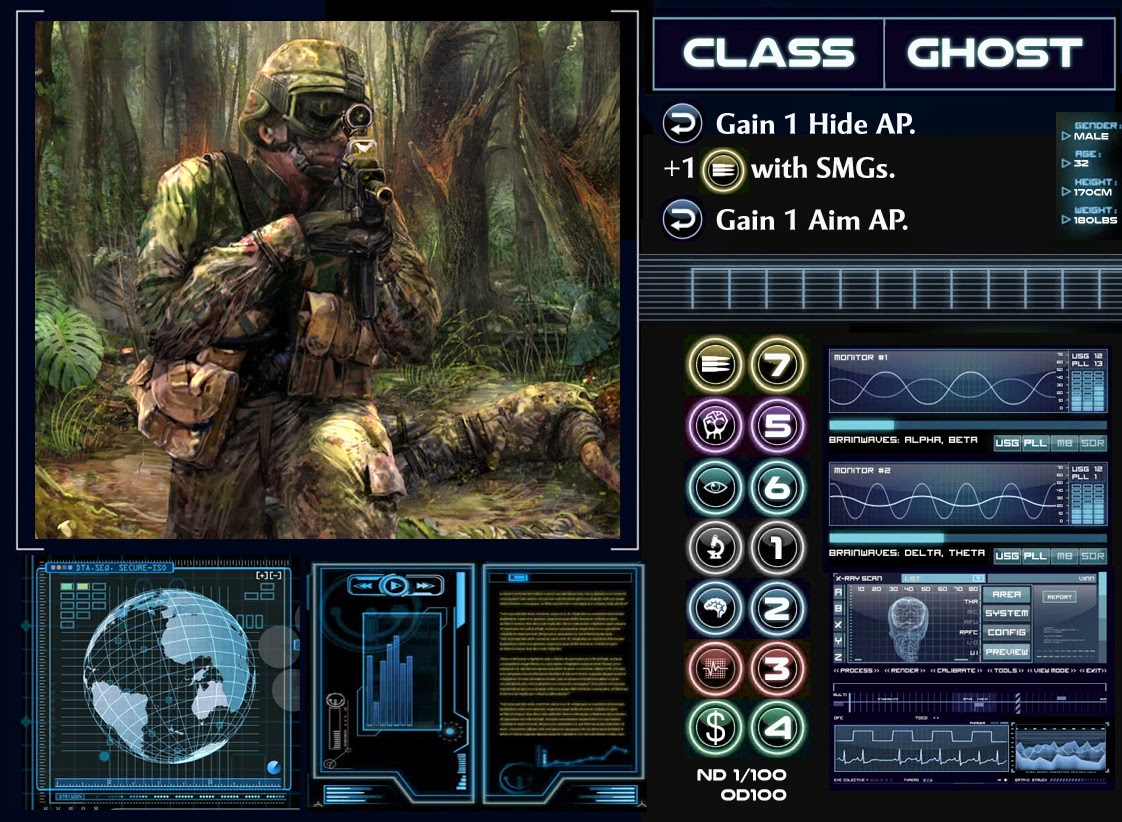 Oh Dark Hundred is a cooperative card game for 1-4 players who take a ‘present day to near future’ squad of elite soldiers up against a series of enemy bases and targets over the course of a military campaign. You’ll be levelling up your squad, purchasing new gear, upgrades and skills, infiltrating lairs, hacking security, and taking out terrorists, rebels and their henchmen through the scope of a sniper rifle, down the barrel of a machine gun or with the blade of your knife as you choose your own specialist approach to tackling each objective. Sort of Phantom Leader with commandos instead of aeroplanes. Here is a sneak preview of the card design I’ve been using…